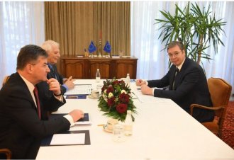 U Briselu je oko 16.40 počeo sastanak predsednika Srbije Aleksandra Vučića sa komesarom EU za spoljnu politiku i bezbednost Žozepom Boreljom i specijalnim izaslanikom EU za dijalog Miroslavom Lajčakom.