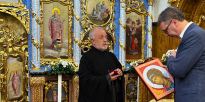 Sveštenik je poklonio predsedniku ikonu arhangela Mihaila i jedan dukat, a predsednik je zahvalio i rekao da će mu taj dragi poklon stajati na posebnom mestu u Predsedništvu Srbije.