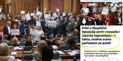 Naime, portal u vlasništvu tajkuna Dragana Šolaka objavio je tekst pod naslovom „Pršti u Skupštini: Opozicija unela vuvuzele i izbacila naprednjake iz takta, ovakve scene parlament ne pamti“.