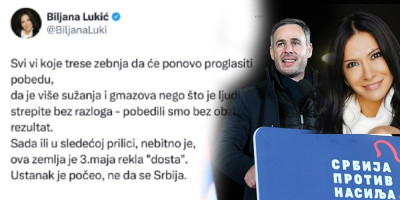 - Svi vi koje trese zebnja da će ponovo proglasiti pobedu, da je više sužanja i gmazova nego što je ljudi, strepite bez razloga - pobedili smo bez obzira na rezultat. Sada ili u sledećoj prilici, nebitno je, ova zemlja je 3. maja rekla "dosta". Ustanak je počeo, ne da se Srbija - napisala je Lukić na društvenoj mreži "Iks".