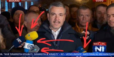 Naime, kako se može videti na video snimku, današnje nasilje đilasovaca u Beogradu je medijsko praćeno isključivo od strane medija iz zemalja iz regiona i EU koje ne žele dobro Srbiji, kao i N1 i Nove S.
