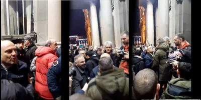 Konkretno, demonstranti su ispred vrata izgurali čoveka (maslinasto zelena jakna), koje je pokušalo da ih odvrati od nasilnog upada u Gradsku skupštinu.