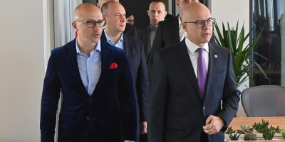 Današnjem otvaranju rekonstrisane zgrade prisustvovali su šef Kabineta potpredsednika Vlade Žarko Mićin i suosnivač kompanije Vega IT Saša Popović.