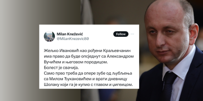 - Željko Ivanović kao rođeni Kraljevčanin ima pravo da bude opsjednut sa Aleksandrom Vučićem i njegovom porodicom. Bolest je svačija. Samo prvo treba da opere zube od ljubljenja sa Milom Đukanovićem i vrati dnevnicu Šolaku koji ga je kupio s glavom i džigericom - napisao je Knežević na platformi Iks.