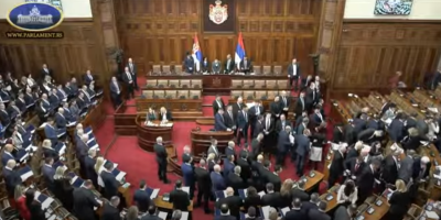 U Skupštini Srbije danas u 10 časova održana je konstitutivna sednica, gde je potvrđen mandat svih 250 narodnih poslanika i čime je konstituisan novi saziv parlamenta. Početak sednice obeležili su zvižduci i urlici poslanika opozicije. U jednom momentu u skupštinsku salu je ušlo i obezbeđenje.