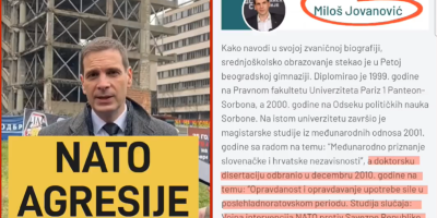 - Danas obeležavamo 25. godišnjicu NATO agresije... - rekao je Jovanović za srpske medije, i sve bi bilo u redu da je isti ovaj Miloš Jovanović imao hrabrosti da agresiju pomene u Francuskoj gde je branio svoj doktorat u čijem naslovu je stajalo: "Vojna 𝗶𝗻𝘁𝗲𝗿𝘃𝗲𝗻𝗰𝗶𝗷𝗮 NATO protiv SRJ 1999."