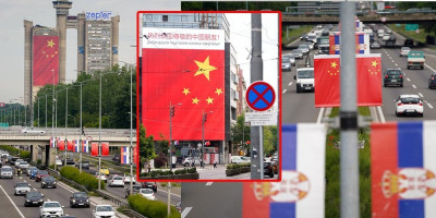 Velika crvena zastava sa pet zlatnih zvezdica pokriva zapadnu kapiju Beograda - Geneks kulu, sa ispisanom porukom dobrodošlice za lidera sa kojom Srbija ima jake ekonomske, ali i političke veze.