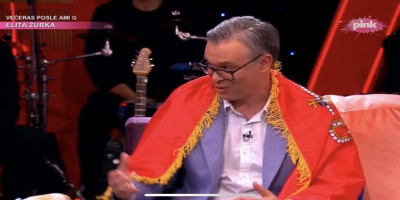 Dalibor Golubović je postao poznat kao najbolji imitator predsednika Vučića. On je u večerašnjoj emisiji ogrnut srpskom zastavom, i zbunjuje ostale goste, pogotovo dvoje ministara.