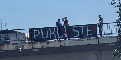 Miran Pogačar i Petar Holik, zajedno sa Brajanom Brkovićem, istakli su baner (transparent), sa sadržinom "Pukli ste" na Mostu Varadinska duga.