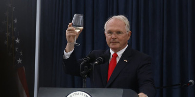 "Samo zajedničkim snagama možemo da stignemo daleko. U to ime želim da podignem čašu srpskog vina kako bih nazdravio našem prijateljstvu", kazao je ambasador koji je govor započeo na srpskom jeziku, a zatim se našalio na kišovito vreme koje je trajalo tokom celog prijema.