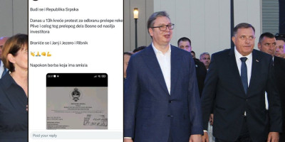 - Budi se i Republika Srpska. Danas u 13h krece protest za odbranu prelepe reke Plive i celog tog prelepog dela Bosne od nasilja investitora Branice se i Janj i Jezero i Ribnik. Napokon borba koja ima smisla - piše na društvenoj mreži Iks.