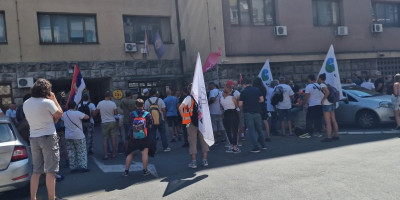 Demonstranti su došli ispred policijske stanice tražeći da policija pusti na slobodu uhapšene huligane koji su blokirali međunarodnu železničku prugu.