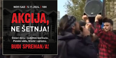 "Novi Sad, 5.11.2024. u 18 časova. Akcija, ne šetnja. Ostavi decu i kućne ljubimce kod kuće. Ponesi vodu, hranu i opremu. Budi spreman/a", piše u pozivu.
