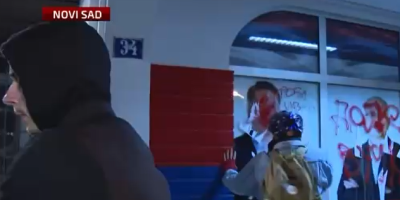 Demonstranti gađaju prostorije štaba Srpske napredne stranke, urliču i vređaju. Gađali su stakla, a tom prilikom su pogodili i jednu ženu u glavu: