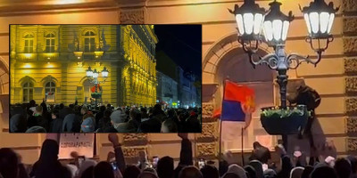 Kako se vidi na snimku, hejteri zastavom Srbije udaraju po zidu Gradske kuće, dok okupljeni ljudi aplaudiraju u delirijumu.