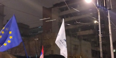 Naime, jedan od okupljenih doneo je zastavu "Euromaidan Serbia" koja poziva na ukrajinski scenario u Srbiji.