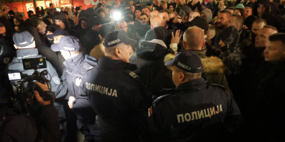 Odmah na početku nasilnog skupa došlo je do koškanja i tuče između prisutnih, bukvalno se ne zna ko koga bije, a u jednom trenutku je došlo i do guranja policijskih službenika.