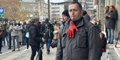 Međutim, sada su izgleda otišli najdalje. Jednog od pripadnika ekstremista koji se nalaze ispred Skupštine je reporter Informera fotografisao sa pišljakom, na koju je zakačena ruka, verovatno plastična, u crvenoj boji (fotografija iznad).