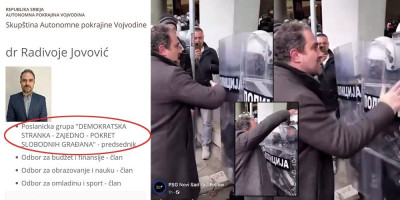 Predsednik Pokreta Slobodnih građana u Novom Sadu i član poslaničke grupe "Demokratska stranka-Zajedno-Pokret slobodnih građana" Radivoje Jovović ponižavao je i maltretirao policajce dok su vršili svoju dužnost štiteći Skupštinu Grada od opozicionih huligana.