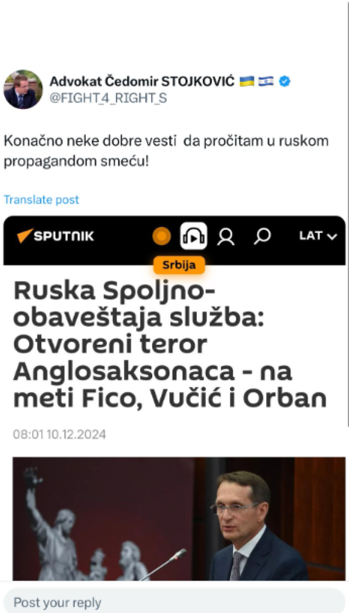 On je, naime, na društvenoj mreži "Iks" podelio vest koju je objavio portal "Sputnjik" gde piše da je Vučićev život u opasnosti, kao i životi Viktora Orbana, mađarskog premijera i Roberta Fica, premijera Slovačke.