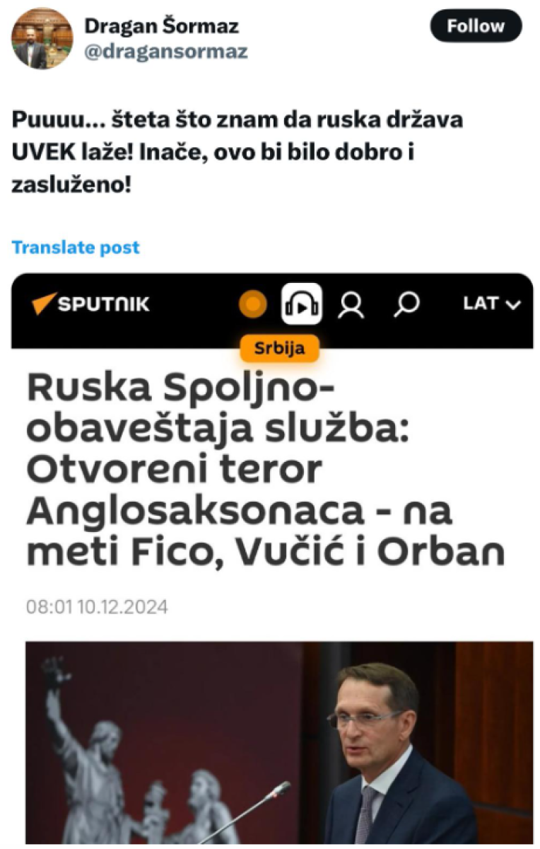 - Puuu...šteta što znam da ruska država UVEK laže! Inače, ovo bi bilo dobro i zasluženo - poručio je Šormaz.