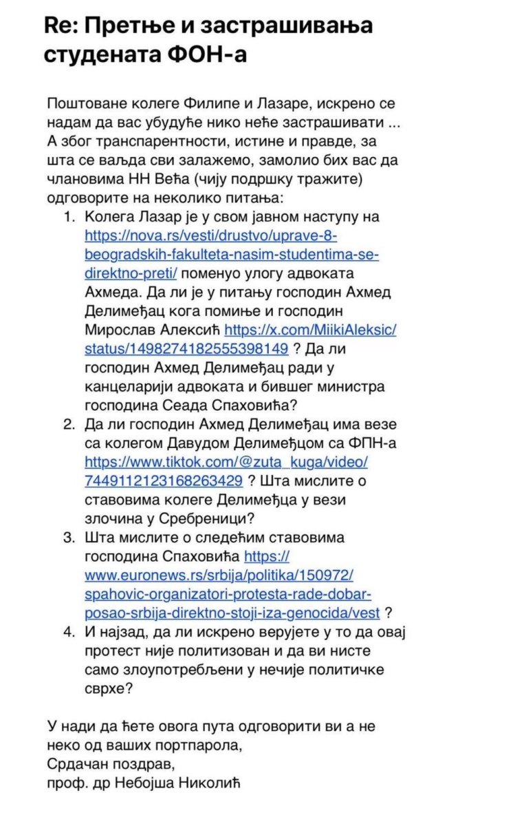 U nadi da ćete ovoga puta odgovoriti vi a ne neko od vaših portparola. Srdačan pozdrav, prof. dr Nebojša Nikolić", navodi se u pismu koje uputio profesor FON-a.