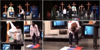 Na kraju predstave, glumica povraća po zastavi Srbije. Šta još kome nije jasno kada je reč o pravcu indoktrinacije kojem je podložna naša omladina u blokadama i da ovo nije udar na vlast koliko je zapravo udar na državu, sve naše vitalne institucije i simbole.