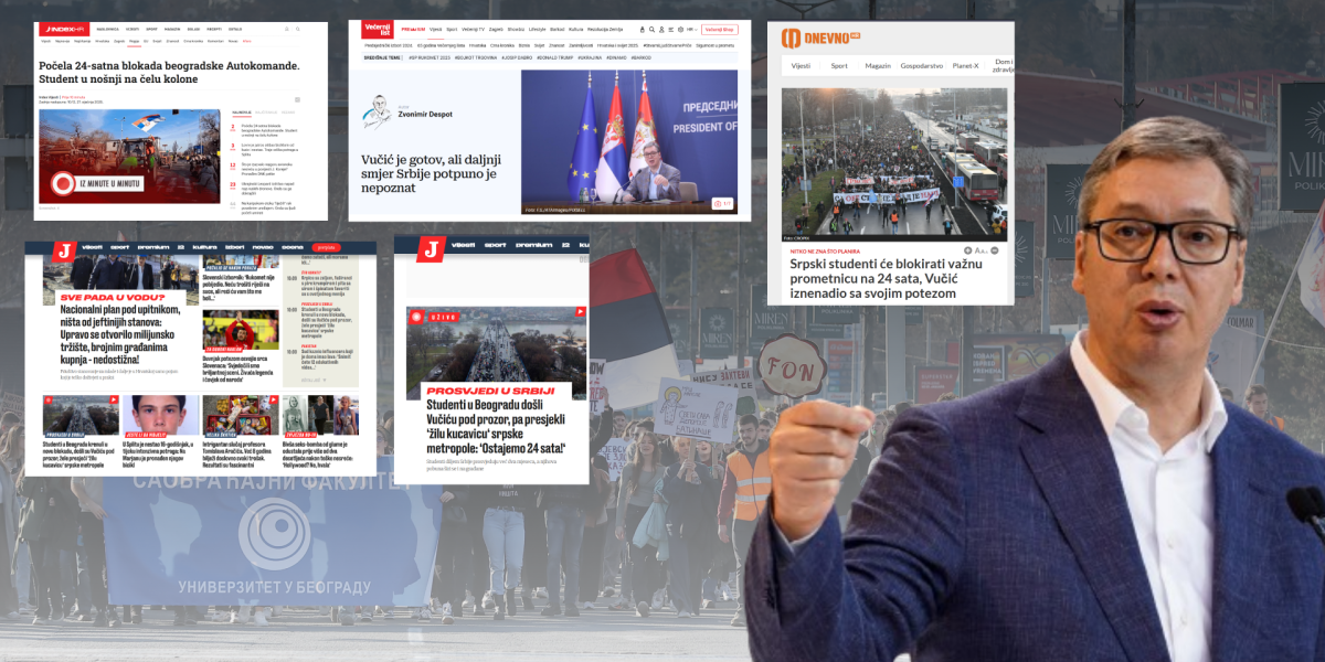 Jutarnji list, propagandno glasilo Zagreba, na udarnom mestu objavio je tekst pod naslovom: "Studenti u Beogradu presekli 'žilu kucavicu' srpske metropole: Ostajemo 24 sata!; Vučić najavio odgovor: 'Slede važne vesti'.