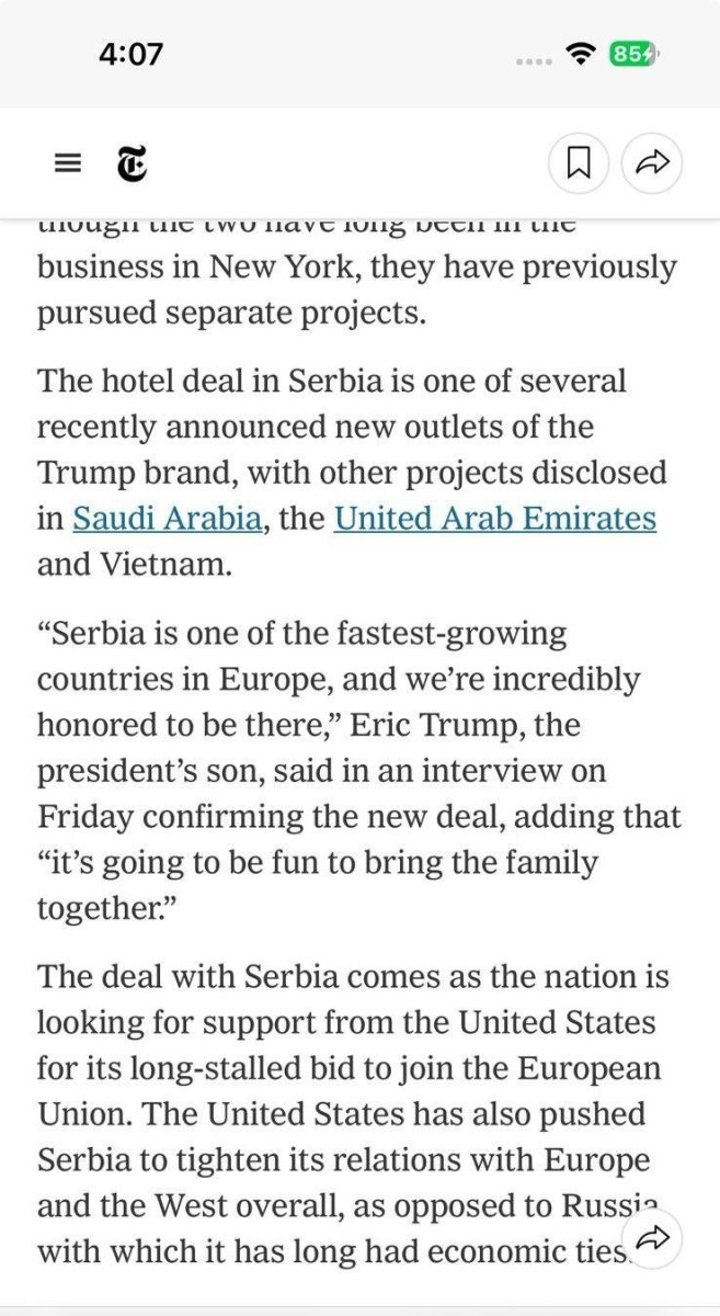 - Srbija je jedna od najbrže rastućih zemalja u Evropi i mi smo neverovatno počastvovani da bude tamo - rekao je Erik Tramp, sin predsednika SAD Donalda Trampa, potvrđujući dogovor.