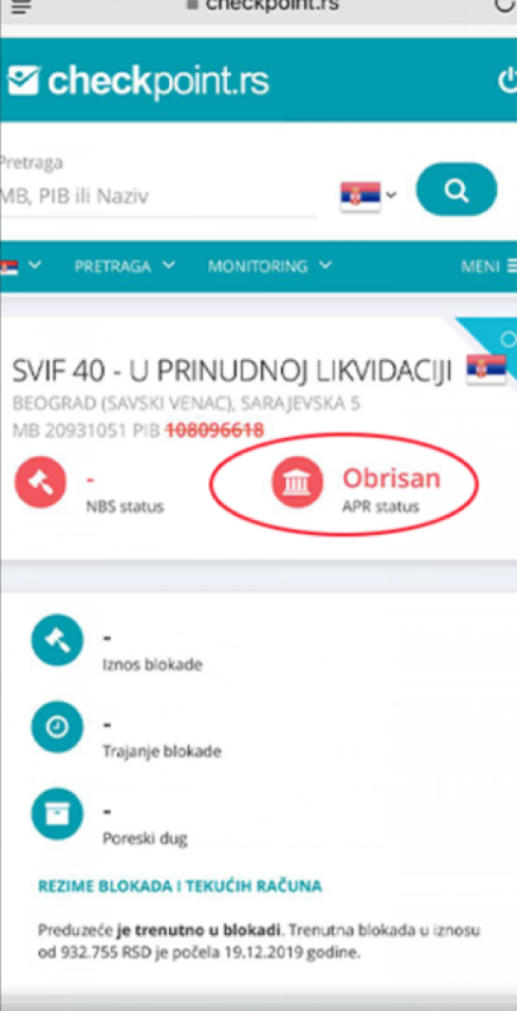 - "Svif 40" obrisano iz APR, u blokadi od 2019, iznos 932.755 dinara