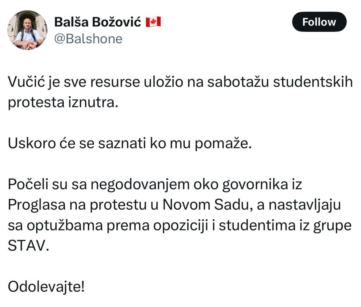 - Počeli su sa negodovanjem oko govornika iz Proglasa na protestu u Novom Sadu, a nastavljaju sa optužbama prema opoziciji i studentima uz grupe STAV. Odolevajte - naveo je Božović.