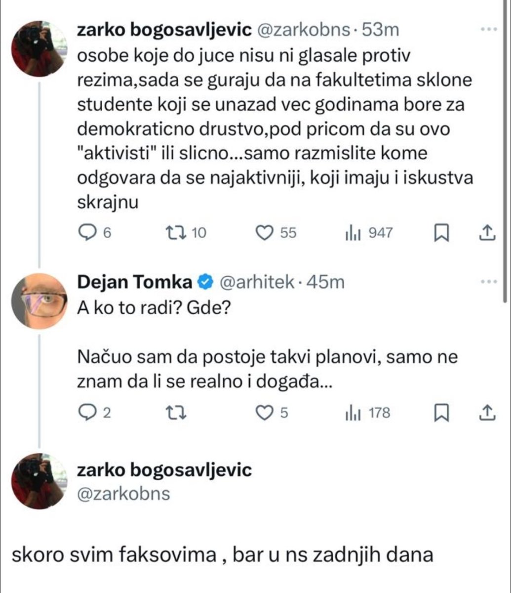 - Osobe koje do juče nisu ni glasale protiv režima, sada se guraju da na fakultetima sklone studente koji se unazad vec godinama bore za demokratično društvo, pod pričom da su ovo "aktivisti" ili slično...samo razmislite kome odgovara da se najaktivniji, koji imaju i iskustva skrajnu - napisao je opozicioni novinar iz Novog Sada.