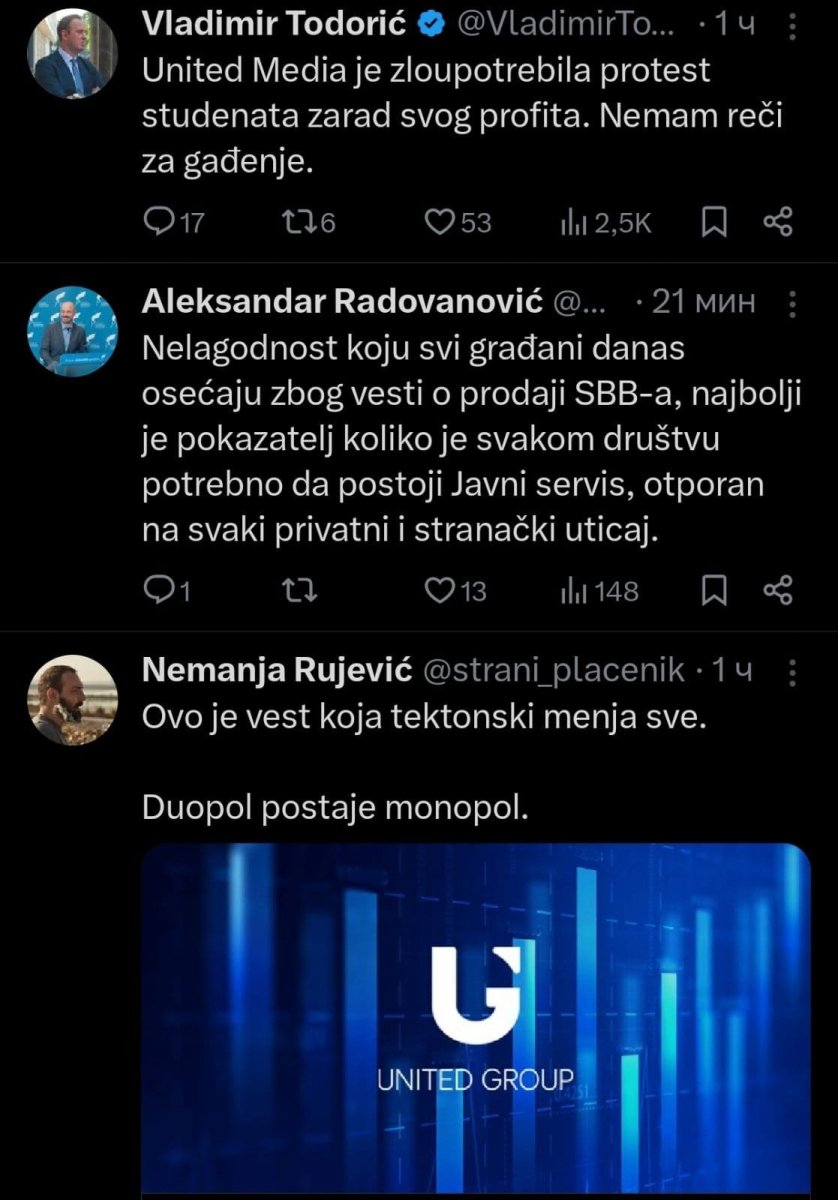 Nemanja Rujević, kolumnista, uzburkan od novonastalih dešavanja, upozorava da prodaja SBB-a znači kraj duopola, odnosno ulazak u monopol, koji može potpuno da uništi medijsko tržište.