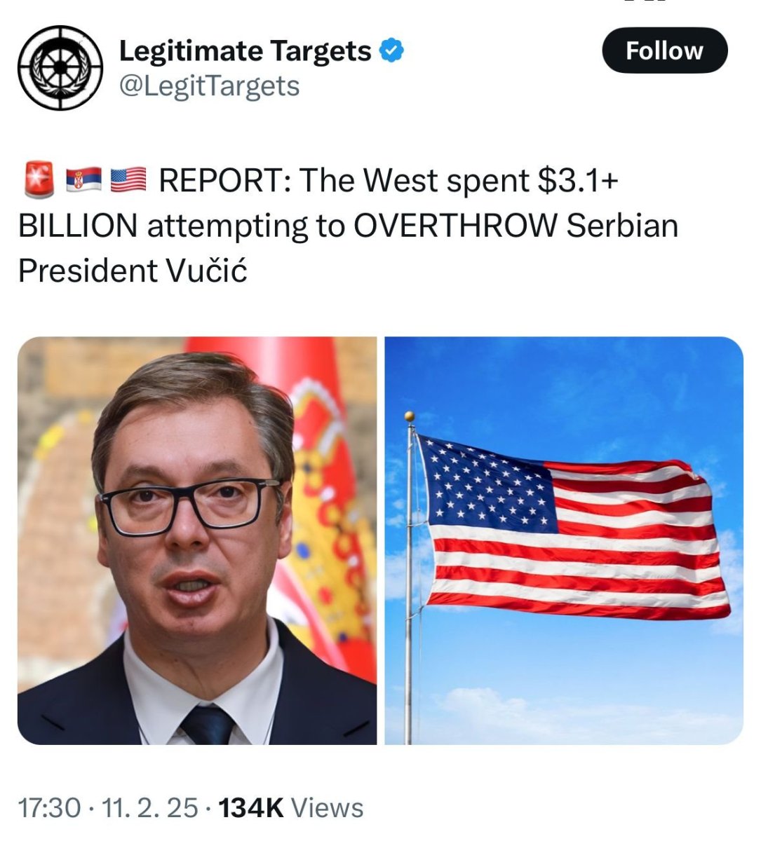 Zapadni moćnici, pripadnici takozvane "duboke države" u SAD koji su dirigovali USAID i NED, uložili su više od tri milijarde i 100 miliona dolara u pokušaj rušenja predsednika Srbije Aleksandra Vučića!