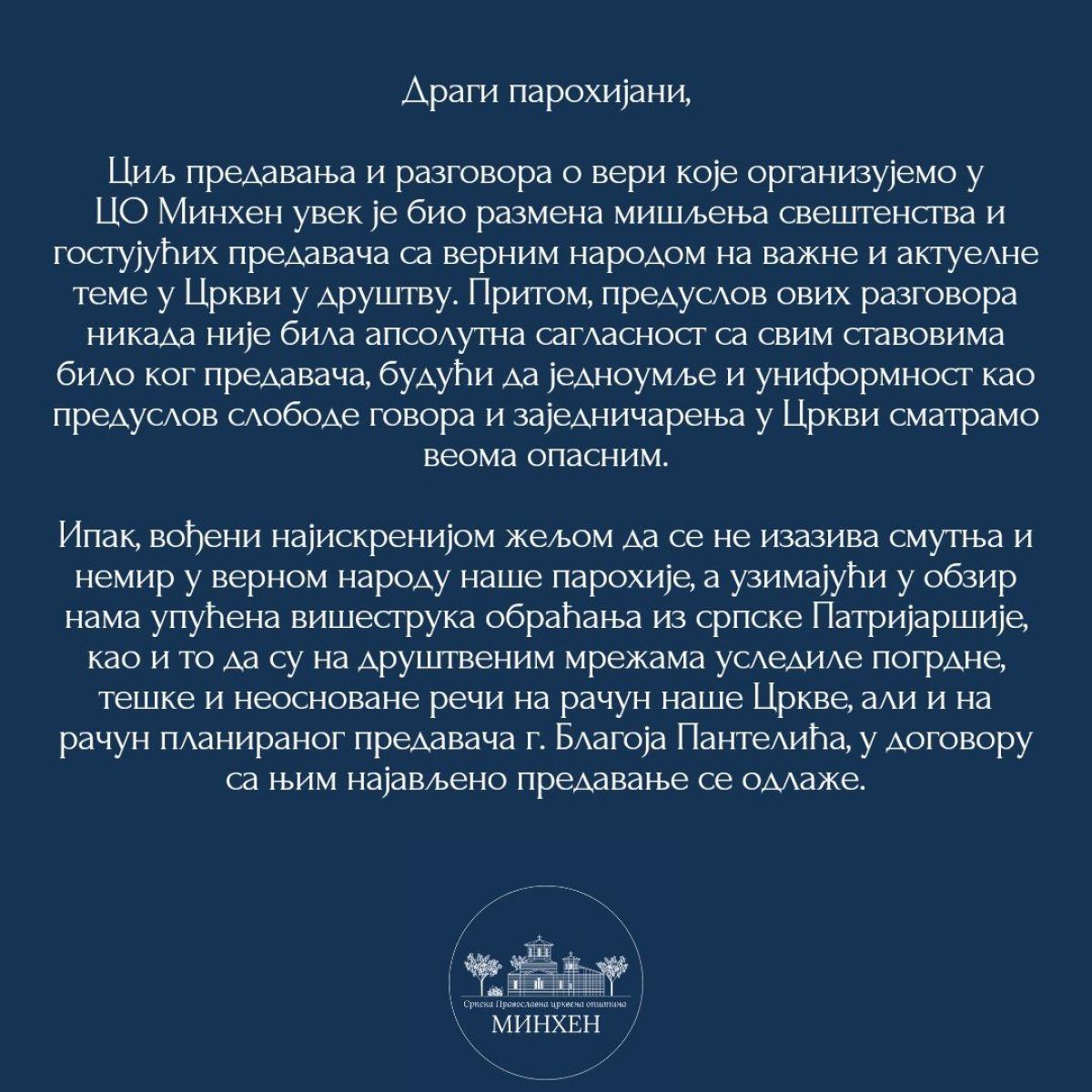 U Srpskoj Crkvi u Minhenu se u petak 14. februara u 19 časova organizuje predavanje koje će držati Srbomrzac i gej lobista Blagoje Pantelić, koji je javno pretio da će da jaše našeg patrijarha Porfirija i da ima spisak za odstrel sveštenstva kao što su to nekada radili bezbožni komunisti, mada ni oni nisu bili toliko cinični da organiziju u Crkvi predavanje takvim ljudima i pozivaju verni narod da ih sluša. Predavanje se organizuje blagoslovom vladike Grigorija i starešine crkve Bojana Simića, čime su i jedan i drugi ovim potezom stupili u raskol sa Srpskom Pravoslavnom Crkvom.