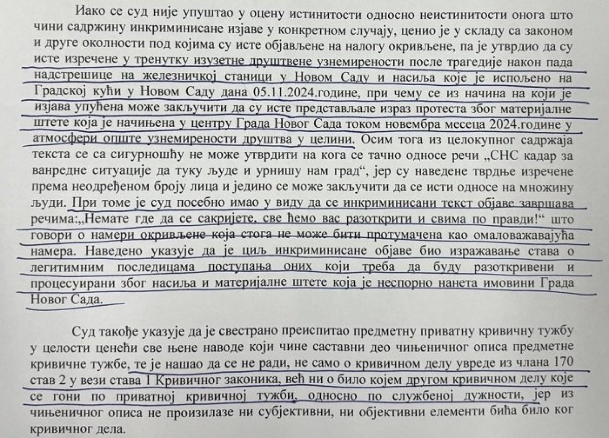 Poslednji deo, izrečena pretnja: „Nemate više gde da se sakrijete, sve ćemo vas razotkriti i svima po pravdi!“, takođe je dobila sramno obrazloženje sudije: „Što govori o nameri okrivljene koja stoga ne može biti protumačena kao omalovažavajuća namera. Navedeno ukazuje da je cilj inkriminisane objave bio izražavanje stava o legitimnim posledicama postupanja onih koji treba da budu razotrkiveni i procesuirani zbog nasilja i materijalne štete koja je neposredno naneta imovini Grada Novog Sada“.