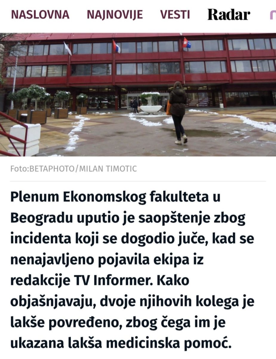 Naime, plenum Ekonomskog fakulteta u Beogradu uputio je skandalozno saopštenje zbog kako oni kažu "incidenta" koji se dogodio juče, kad se pojavila naša ekipa - Informer TV.