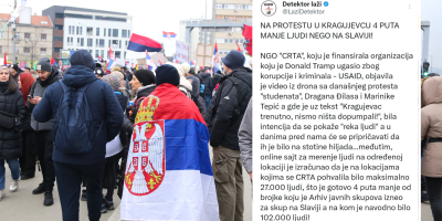 Nevladina organizacija CRTA, NVO koja posluje pod okriljem USAID koga je američki predsednik Donald Tramp označio kao kriminalnu organizaciju, u šokantnom nastupu iskrenosti priznao je da je na opozicionom protestu u Kragujevcu bilo 4 puta manje ljudi nego na protestu na Slaviji.