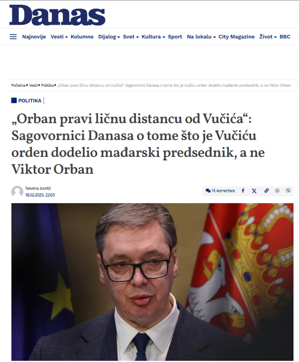 Tabloid Danas, niskotiražni tajkunski megafon, glasilo ekstremnih antisrpskih hejtera, objavio je članak u kom su pokušali da umanje značaj ordena koji je predsednik Srbije dobio u Budimpešti.