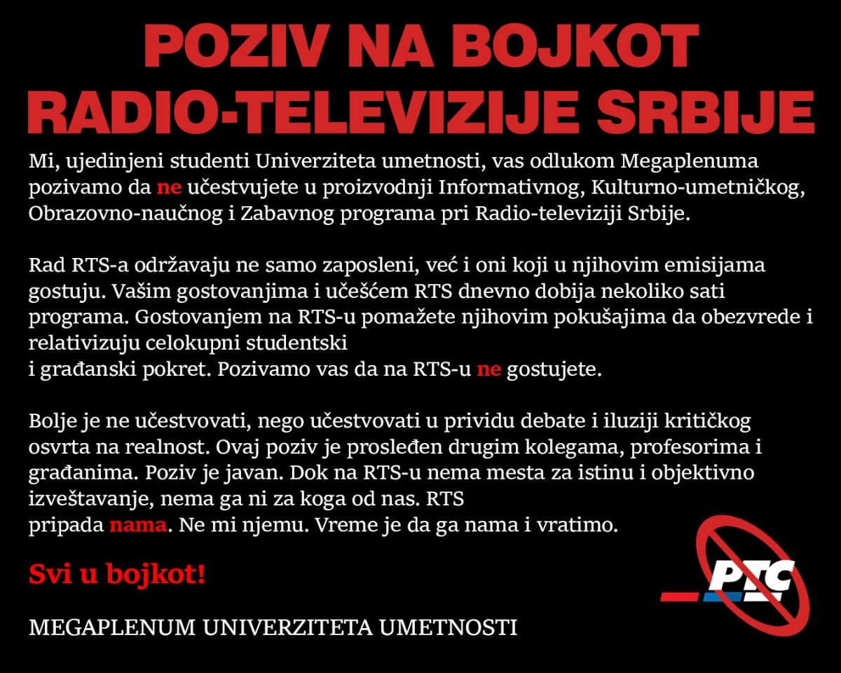 Takozvani studenti sa Univerziteta umetnosti pozvali su na bojkot RTS-a, na bojkot proizvodnje Informativnog, Kulturno-umetničkog, Obrazovno-naučnog i Zabavnog programa, čak su pozvali i ljude da ne gostuju na Javnom servisu.