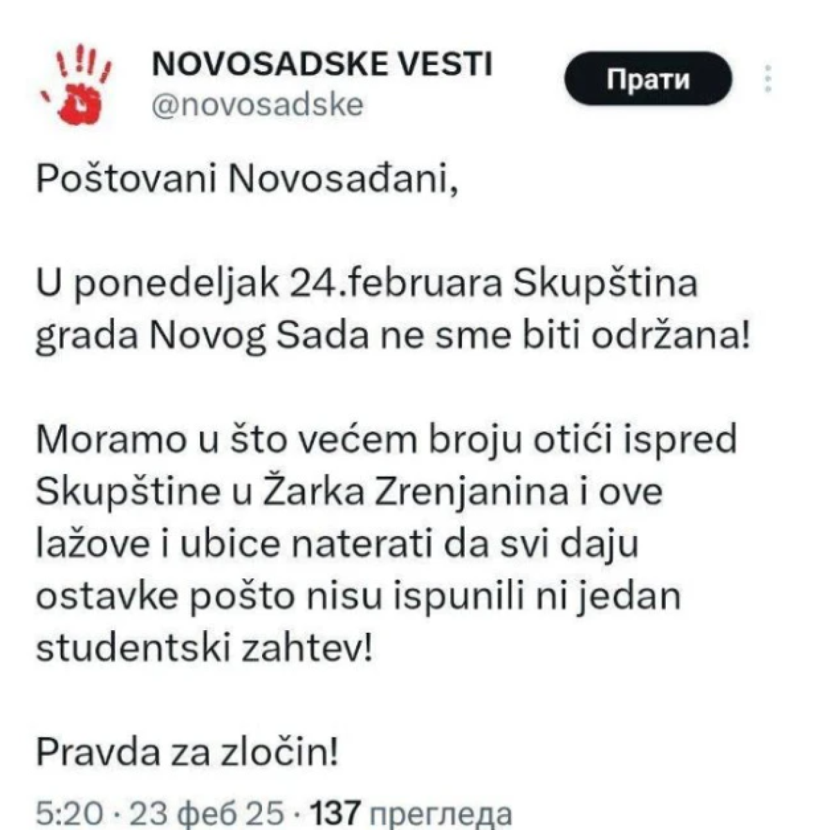 Društvenim mrežama kruže masovni pozivi i uputstva za novi talas nereda na sutrašnjoj sednici Skupštine Grada Novog Sada, na kojoj je planirano imenovanje budućeg gradonačelnika.