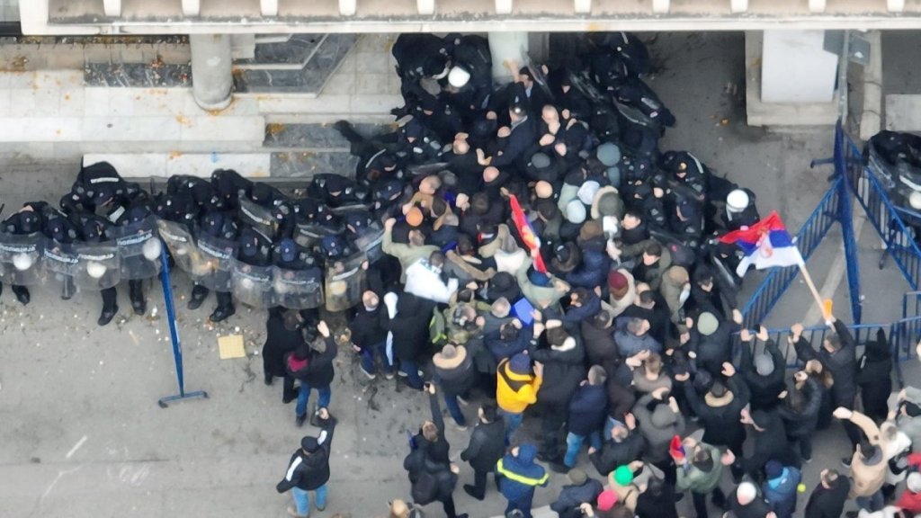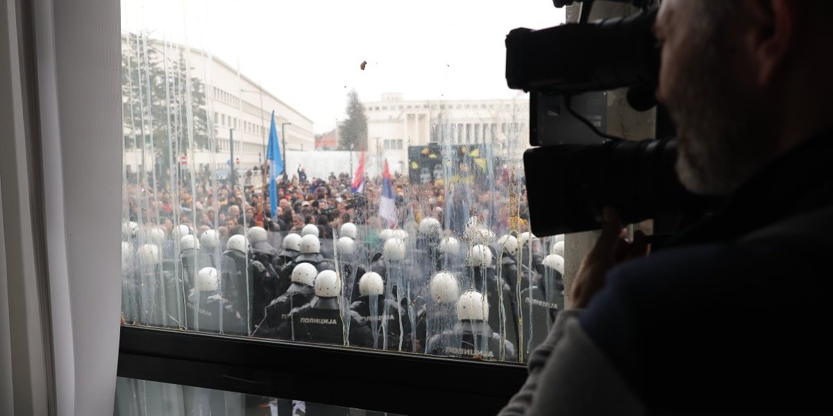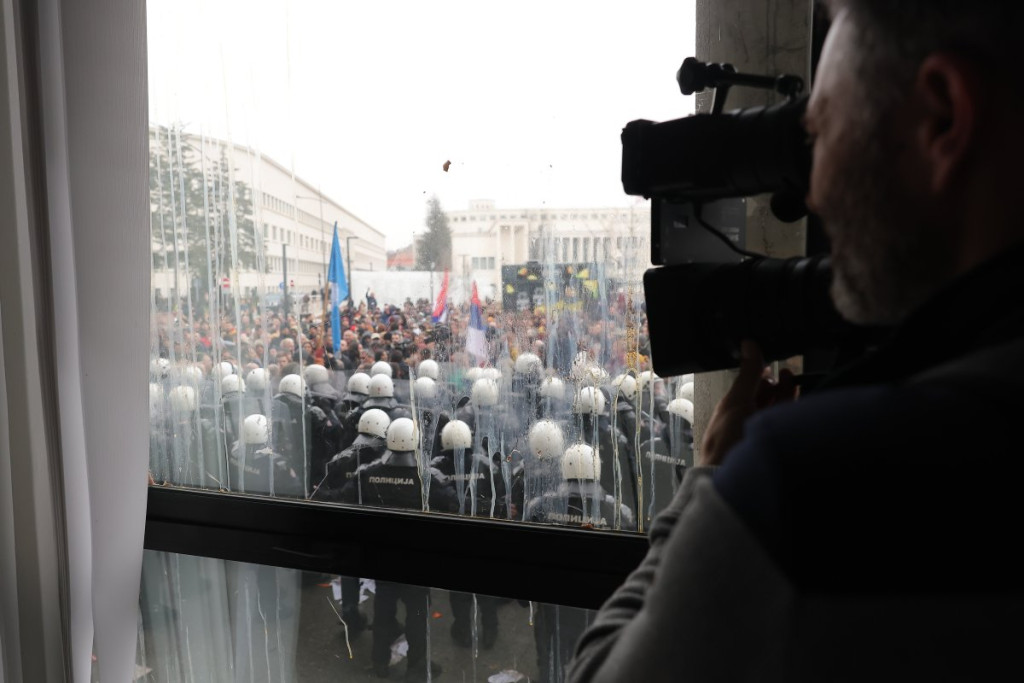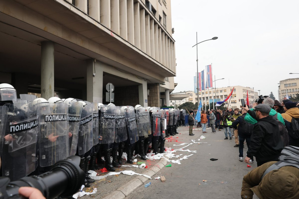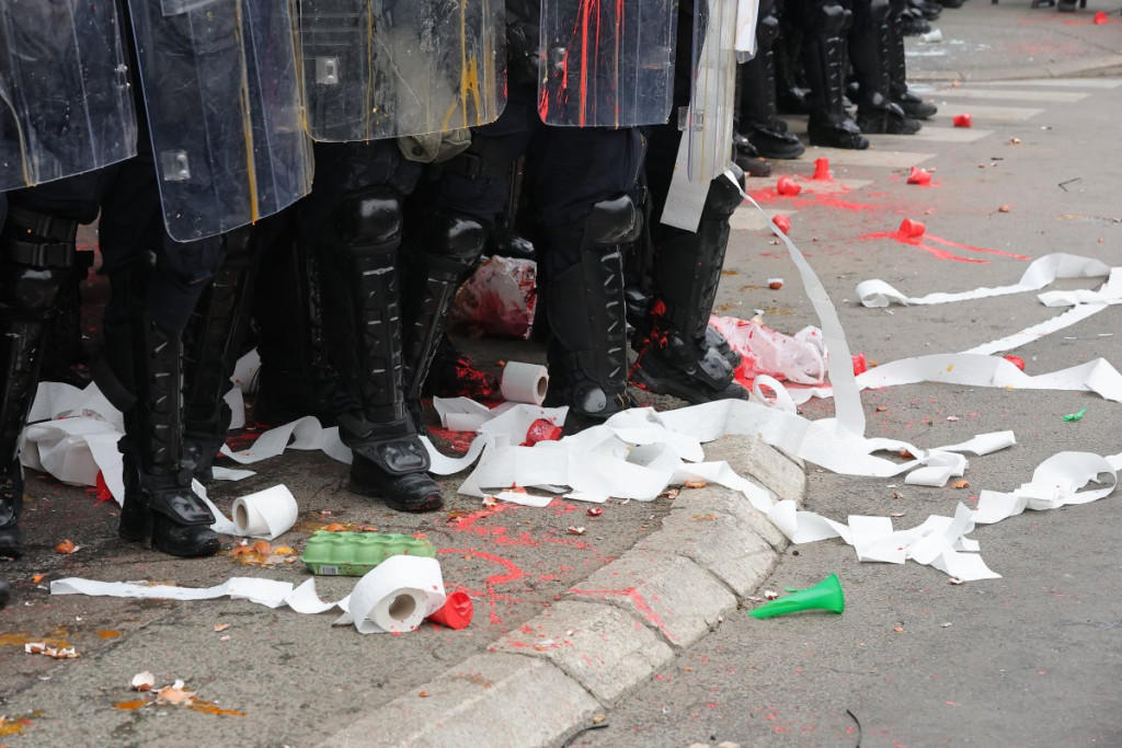 Ekstremisti su počeli da gađaju jajima policijske službenike koji su angažovani na obezbeđenju kao i zgradu Skupštine grada Novog Sada, takođe jedan deo okupljenih građana pokušava fizičkom snagom da probije kordon policije.