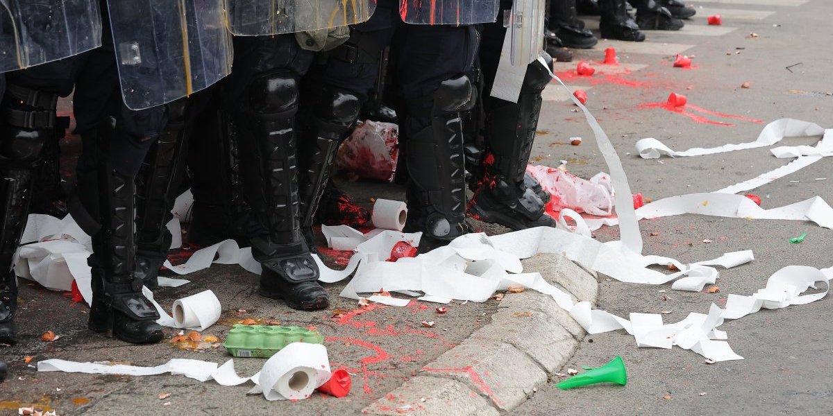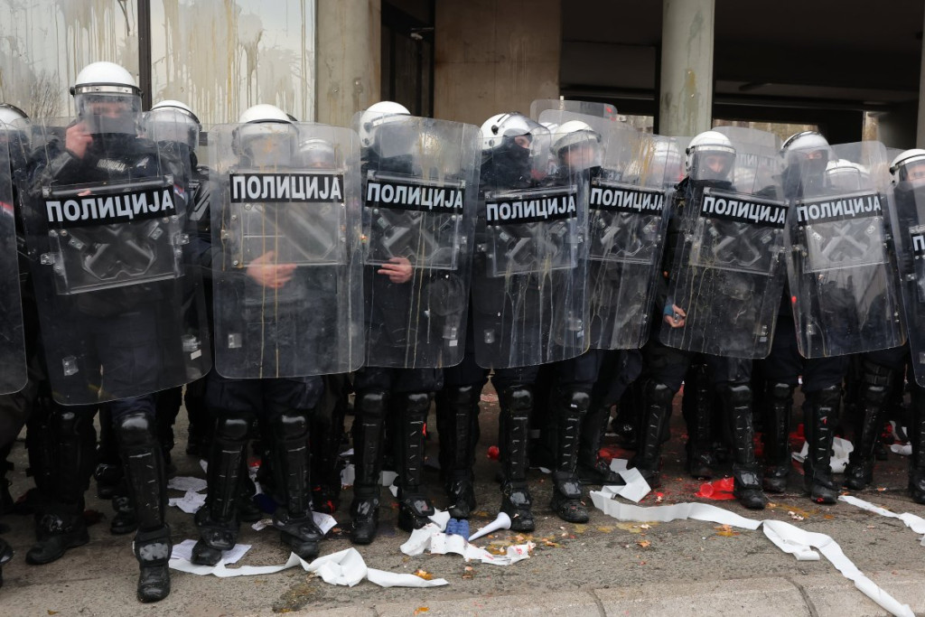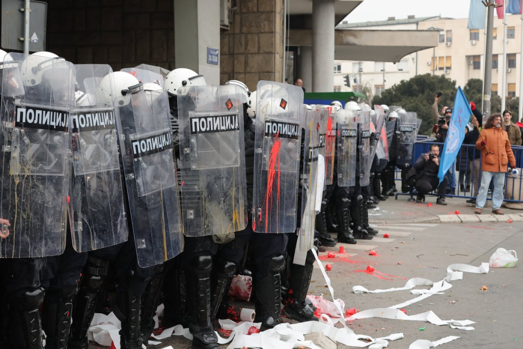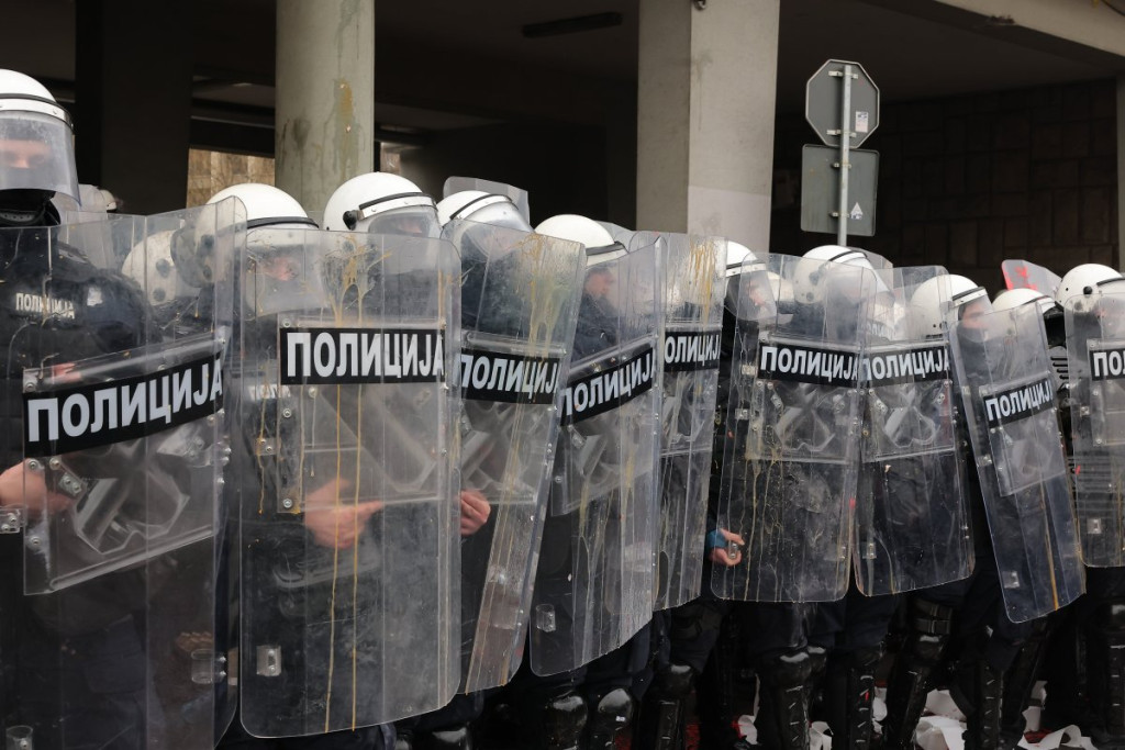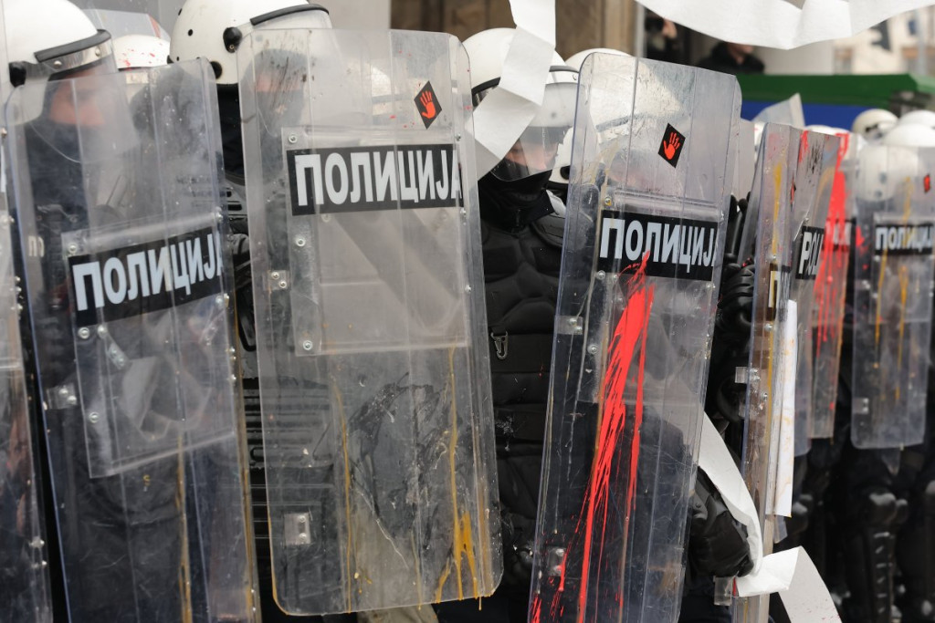 Okupljeni građani ispred zgrade Skupštine grada Novog Sada gađaju brašnom pripadnike policije.