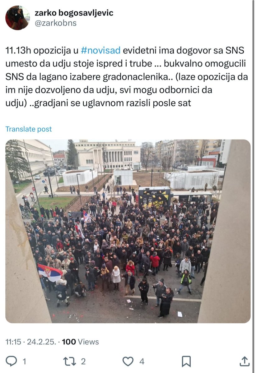 "Opozicija u Novom Sadu evidentno ima dogovor za Srpskom naprednom strankom, umesto da uđu, stoje ispred i trube... Bukvalno omogućili SNS da lagano izabere gradonačelnika. Laže opozicija da im nije dozvoljeno da uđu, svi mogu odbornici da uđu. Građani se uglavnom razišli posle sat” napisao je Bogosavljević na društvenim mrežama.