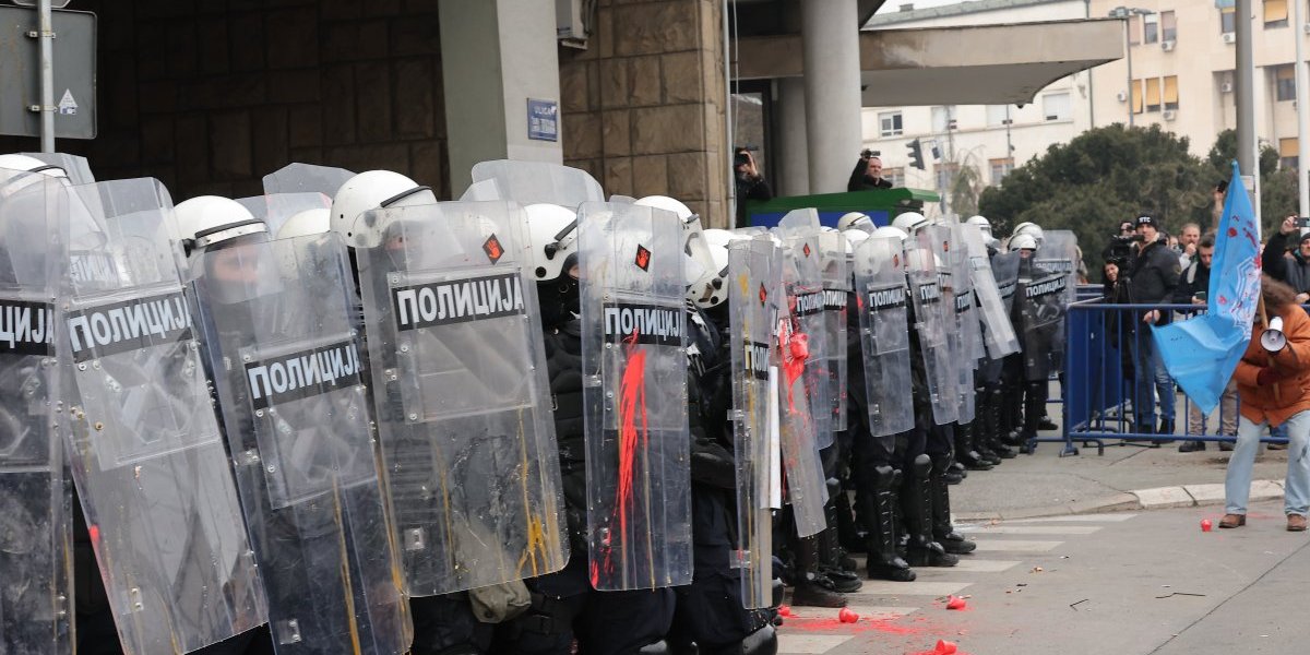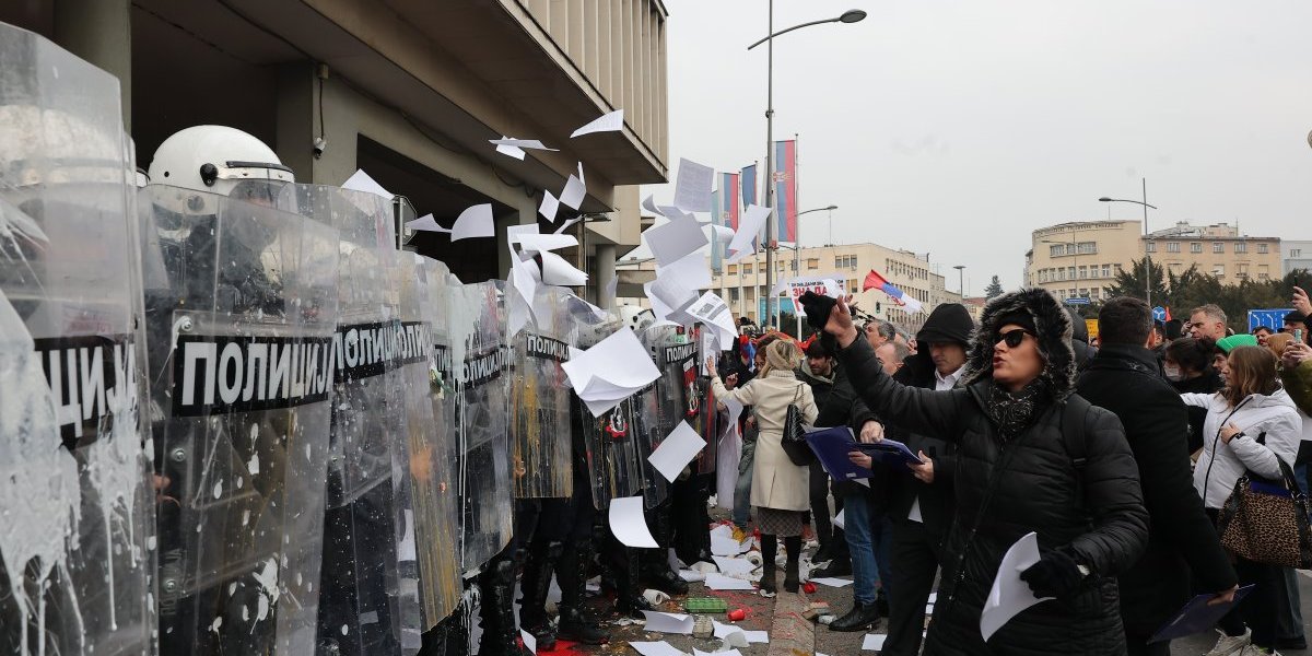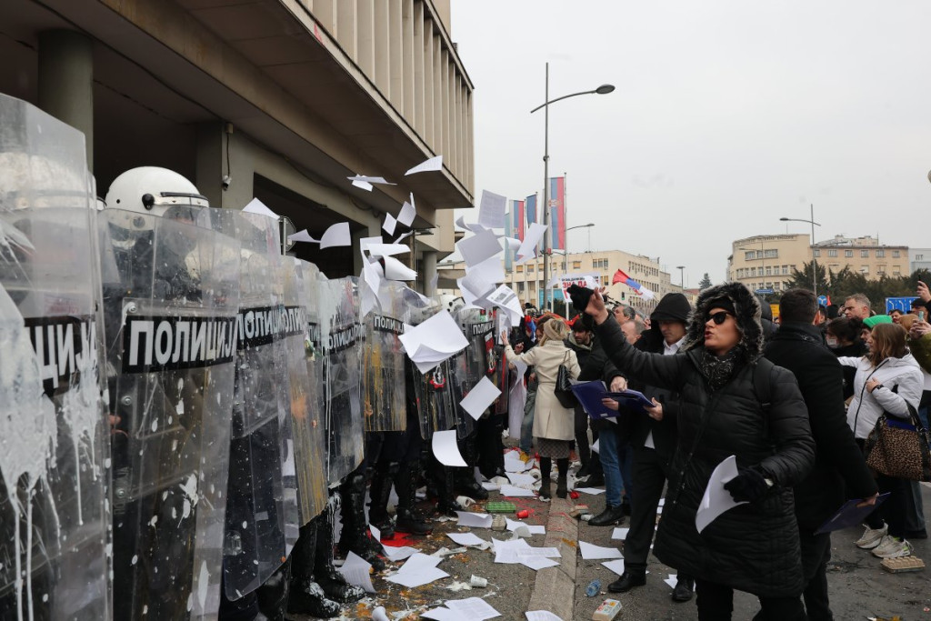 Predstavnici opozicije za vreme trajanja sednice jajima, jogurtom, crvenom farbom i toalet papirom gađaju pripadnike policije koji obezbeđuju zgradu i duvaju u pištaljke i vuvuzele, a među njima su opozicioni političari Pavle Grbović, Janko Veselinović, Miša Bačulov, Vladimir Štimac, Borislav Novaković.