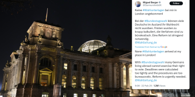 - Kod mene u Londonu nisu stigli izborni materijali. Mnogi Nemci koji žive u inostranstvu neće moći da ostvare svoje biračko pravo i glasaju na izborima za Bundestag. Rokovi su pretesni, a procedure birokratske. Reforme su hitno potrebne - naveo je ambasador uoči održavanja parlamentarnih izbora u Nemačkoj.
