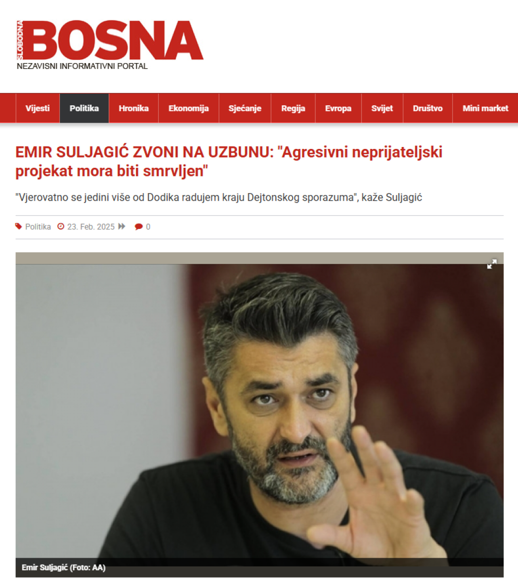 - Za jedno 10-20 godina pisaće se da je Dodik najzaslužniji za obnovu državnosti BiH onako kako je zamišljena 1. marta 1992. godine. Verovatno se jedini više od Dodika radujem kraju Dejtonskog sporazuma koji je sašio mrtvačke gaće samo za nas, nastavak borbe sa jednom ili obe ruke vezane na leđima. Veselim se obnovi Armije RBiH, AID-a i drugih institucija koje će konačno moći da tretiraju srpski projekt u BiH onako kao između 1992. i 1995. - agresivni neprijateljski projekt koji mora biti smrvljen kao pitanje egzistencijalnog imperativa - zapretio je Suljagić.
