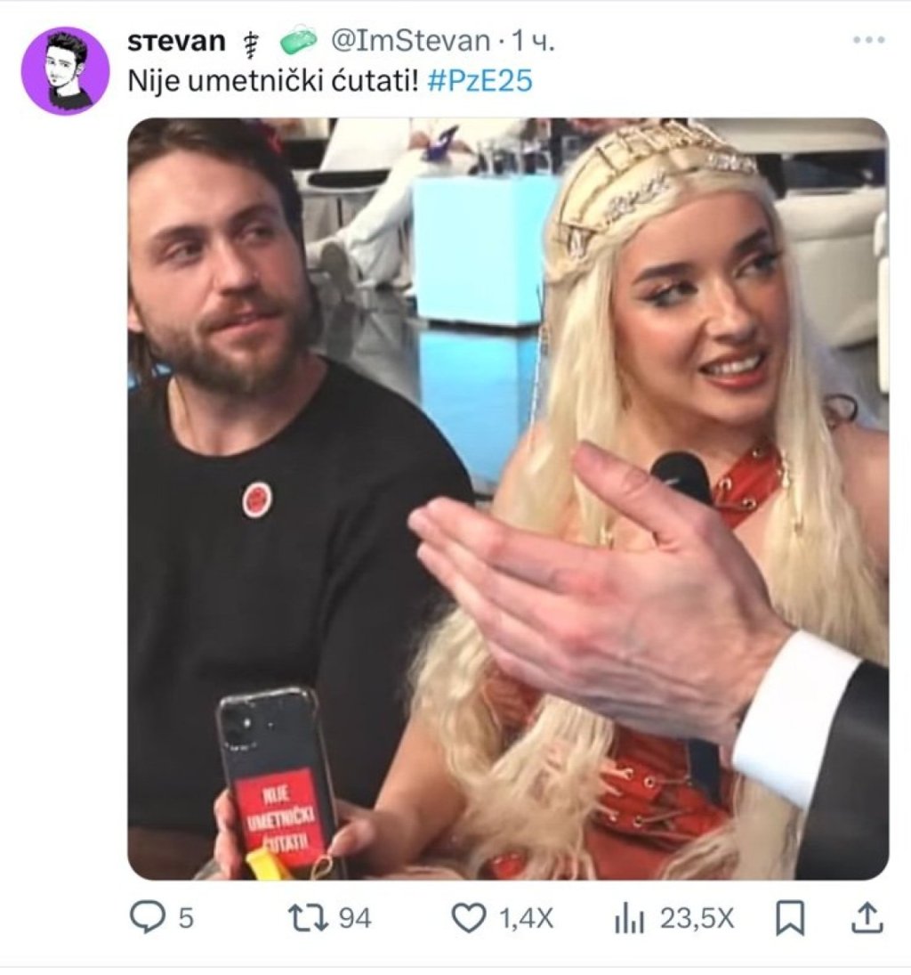 I juče smo postavili isto pitanje kao i sada. Na takmičenju za Evroviziju strogo je zabranjeno isticanje bilo kakvih političkih parola, pa nam ostaje da vidimo da li će RTS, PZE i ostali da reaguju po ovom pitanju.