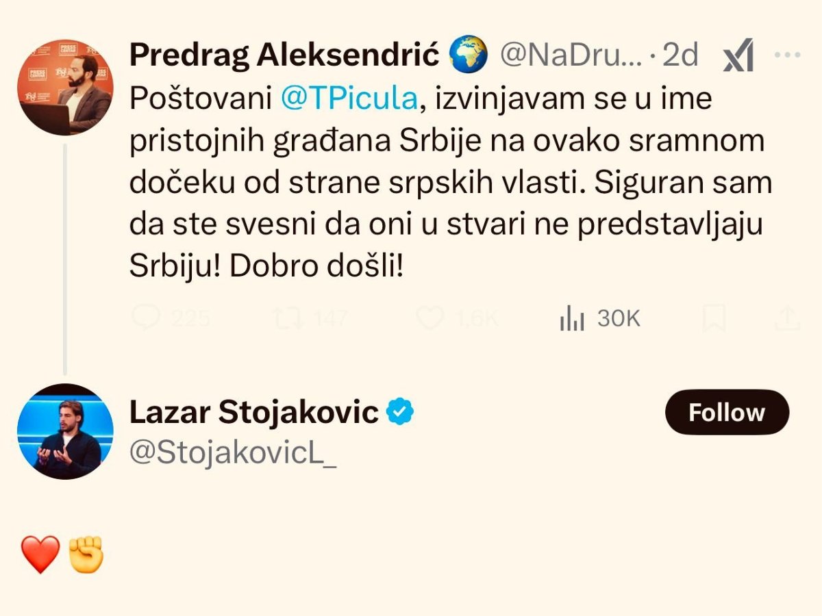 Lazar Stojaković, vođa blokadera, lažni student sa roleksom od 15.000 evra, čiji je brat blizanac priveden u Crnoj Gori i odbio da se podvrgne testu na drogu, ne krije zadovoljstvo zbog hejterskih pridika koje Srbiji deli osvedočeni antisrbin Tonino Picula.