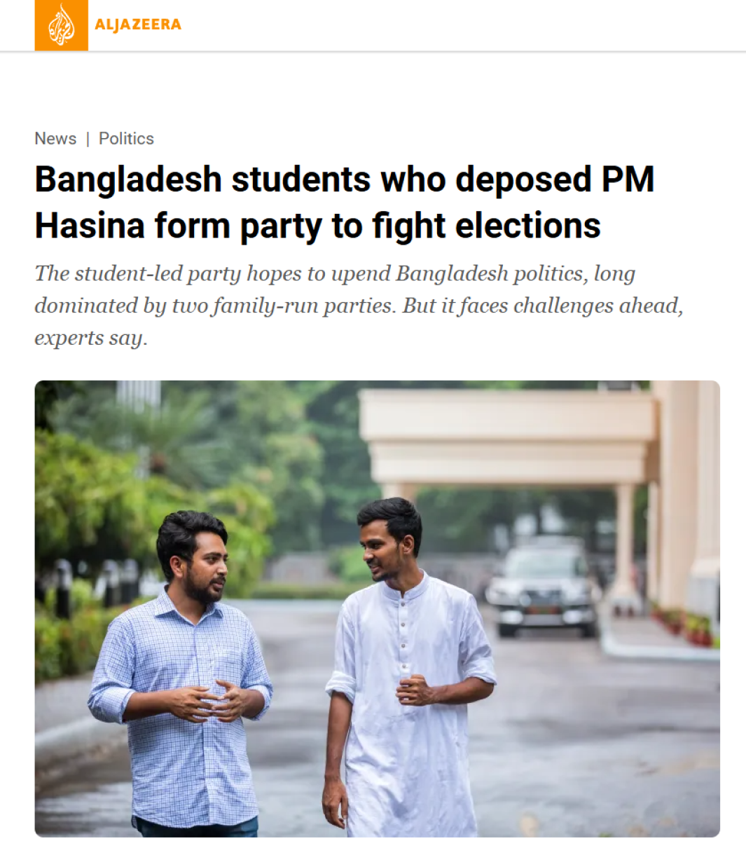 - Studenti iz Bangladeša koji su smenili premijerku Hasinu formirali su stranku za borbu protiv izbora. Partija koju predvode studenti nada se da će preokrenuti politiku Bangladeša, kojom su dugo dominirale dve porodične stranke - navodi se izme|u ostalog u tekstu koji je objavila Al Džazira.